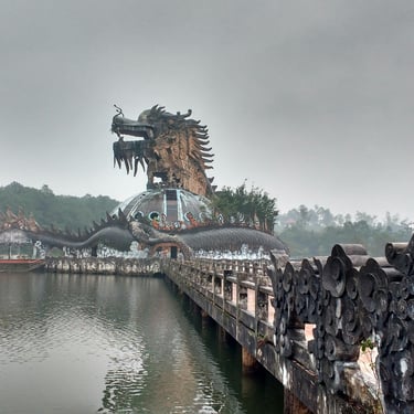 Si tu aimes l’ambiance un peu mystérieuse, direction le parc aquatique Hồ Thuỷ Tiên. Aujourd’hui fermé, il est devenu un spot d’urbex. Au centre, un énorme dragon surplombe le lac, et autour, tu tomberas sur des piscines et des toboggans envahis par la végétation. L’endroit parfait pour une balade insolite.